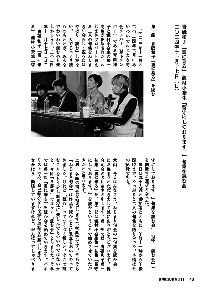 今回はメンバーの句とエッセイだけでなく、特集にねじまき句会メンバーが出版した青砥和子『雲に乗る』、瀧村小奈生『留守にしております。』の「句集を読む会」を収録。